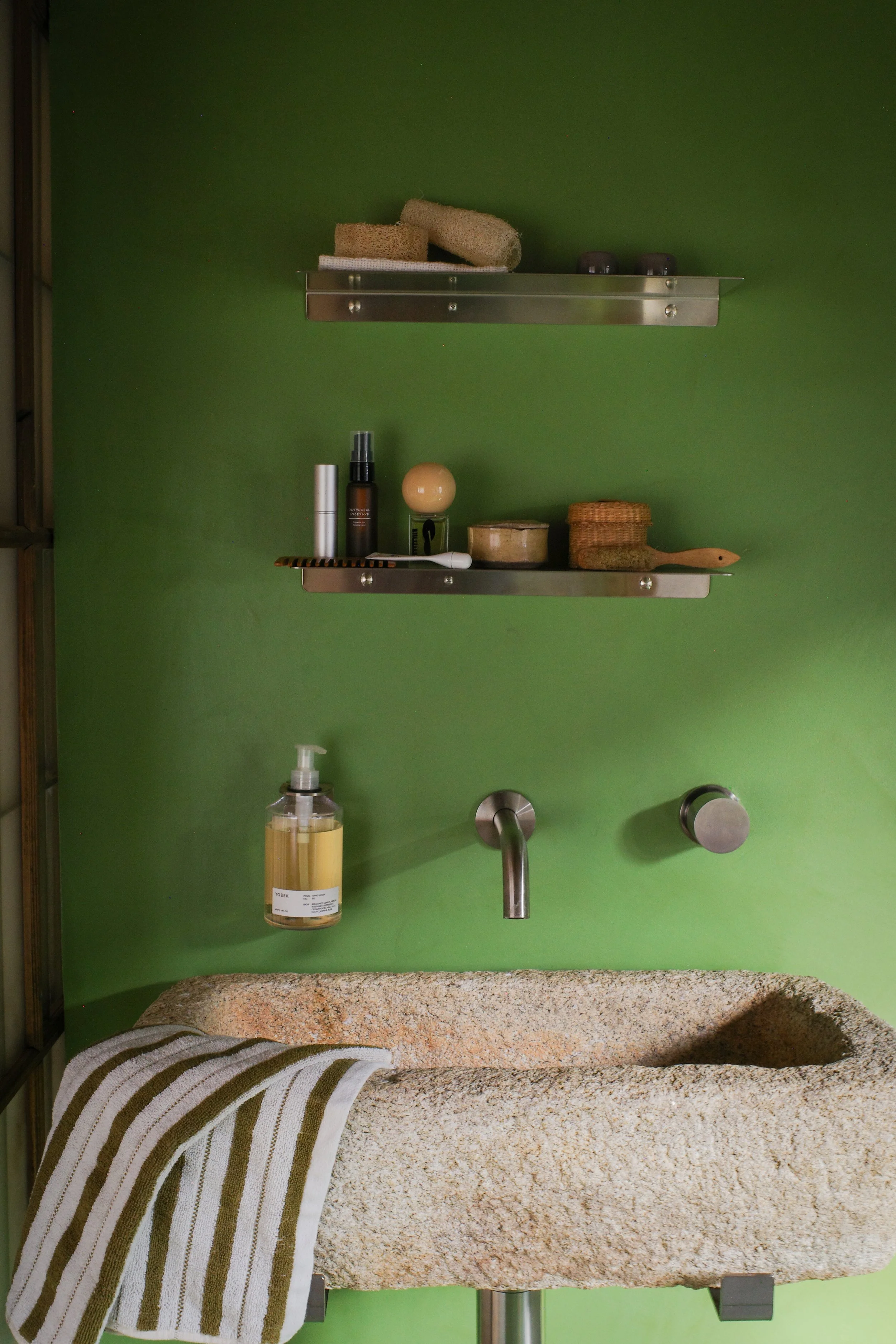 A stone concrete sink with a towel draped over the edge, mounted on a bright green wall with two stainless steel shelves above. The shelves hold various bath accessories including brushes, sponges, and bottles.